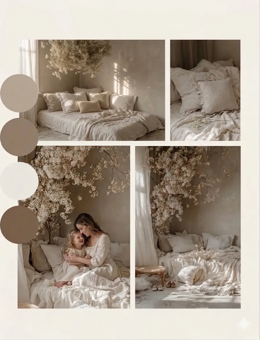Celebrate the bond between mother and child with a dreamy, soft, indoor floral setup features a warm monochromatic bedroom with soft fabrics.